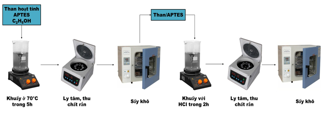 Cân 2g than hoạt tính cho vào cốc thủy tinh chịu nhiệt, thêm 5 mL nước deion, 15 mL ethanol 99%, 2 mL APTES. Khuấy trong vòng 5 giờ ở nhiệt độ 70°C, sau đó ly tâm, thu chất rắn và sấy khô thu được vật liệu than phủ APTES. 1 gam chất rắn sấy khô sẽ được khuấy với 100 mL hydrochloric acid 0,5 M trong 2 giờ không gia nhiệt, sau đó ly tâm, sấy khô chất rắn thu được vật liệu than/APTES đã được acid hoá.