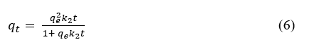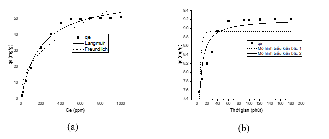 Các thông số động học cung cấp thông tin quan trọng về quá trình hấp phụ để lựa chọn các điều kiện hấp phụ tối ưu. Phân tích 2 mô hình động học biểu kiến bậc một, bậc hai và lựa chọn mô hình phù hợp nhất dựa trên hệ số tương quan. Kết quả cho thấy hệ số tương quan của mô hình biểu kiến bậc hai là 0,91, lớn hơn nhiều so với hệ số tương quan của mô hình biểu kiến bậc một là 0,59 (Hình 4b). Như vậy quá trình hấp phụ tuân theo mô hình biểu kiến bậc hai và sự hấp phụ xảy ra trên 2 trung tâm hấp phụ; nghiêng về hấp phụ hoá học nhiều hơn hấp phụ vật lý.
