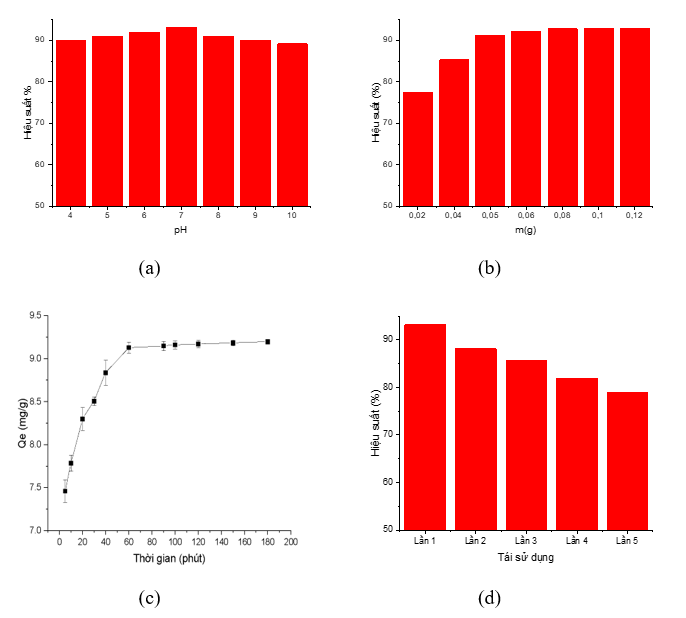 Ảnh hưởng của thời gian hấp phụ đến hiệu suất hấp phụ được khảo sát trong khoảng từ 5 -180 phút (Hình 3c). Từ đồ thị quan sát thấy dung lượng hấp phụ tăng khi tăng thời gian hấp phụ từ 5 đến 60 phút, sau đó dung lượng hấp phụ hầu như không thay đổi và đạt đến cân bằng. Vì vậy, trong các thí nghiệm tiếp theo, thời gian hấp phụ tối ưu được chọn là 60 phút.