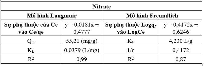 Kết quả thu được cho thấy hệ số tương quan của mô hình Langmuir và Freundlich lần lượt là R2 = 0,99 và R2 = 0,87, cho thấy sự hấp phụ NO3- trên vật liệu là hấp phụ đơn lớp và tuân theo mô hình đẳng nhiệt Langmuir. Dung lượng hấp phụ cực đại được tính toán dựa trên mô hình Langmuir là Qm = 55,21 mg/g. Trong đó: Qm là dung lượng hấp phụ cực đại, KL là hằng số Langmuir thể hiện mức độ ái lực giữa chất hấp phụ và bề mặt chất hấp phụ. KF là hằng số Freundlich thể hiện dung lượng hấp phụ và ái lực của bề mặt đối với chất bị hấp phụ. n là số mũ đặc trưng cho mức độ không đồng nhất của bề mặt và cường độ của quá trình hấp phụ. Khi so sánh giá trị này với các vật liệu khác được sử dụng để hấp phụ NO3- (Bảng 2), có thể thấy dung lượng hấp phụ của vật liệu cao hơn tương đối so với các vật liệu khác như, Xỉ thép (6,15 mg/g); Poly(vinyl alcohol)/ lignin bậc 4 (5,75 mg/g); Chitosan/PEG (50,68 mg/g) và chitosan/PVA (35,03 mg/g); Than hoạt tính biến tính polymer cationic (26 mg/g), cho thấy khả năng hấp phụ của vật liệu là tương đối tốt, có tiềm năng ứng dụng để xử lý các mẫu nước trong thực tế.