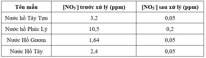 Mẫu nước sau khi lấy cần được xử lý sớm nhất có thể, bảo quản ở nhiệt độ phòng. Trước khi hấp phụ, lọc qua giấy lọc để loại bỏ các tạp chất rắn có trong dung dịch. Xác định nồng độ NO3- trong mẫu, sau đó tiến hành hấp phụ mẫu tại các điều kiện hấp phụ tối ưu (khối lượng vật liệu 0,05 gam, pH 7, thời gian hấp phụ 60 phút, thể tích mẫu nước 10 mL). Xác định nồng độ NO3- còn lại trong dung dịch bằng phương pháp phổ hấp thụ phân tử UV-Vis sử dụng thuốc thử 4- flourophenol.