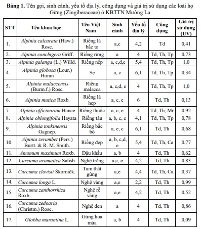 KHẢO SÁT THÀNH PHẦN VÀ GIÁ TRỊ SỬ DỤNG CÁC LOÀI TRONG HỌ GỪNG (ZINGIBERACEAE) TẠI KHU BẢO TỒN THIÊN NHIÊN MƯỜNG LA, TỈNH SƠN LA