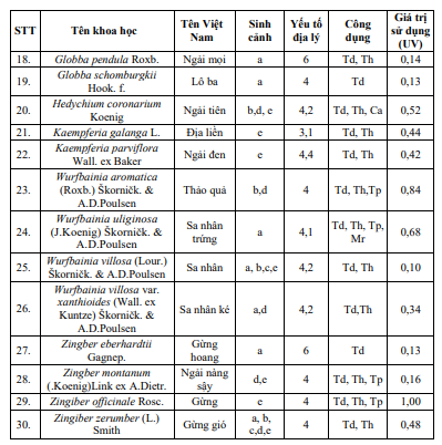 Ghi chú: - Sinh cảnh: a (Rừng bị tác động); b (Rừng ít bị tác động); c (Thảm cây bụi); d (Ven suối); e (vườn nhà). - Yếu tố địa lý: 2,2 Liên nhiệt đới; 4. Nhiệt đới châu Á; 4,1. Đông Dương - Malêzi; 4,2. Lục địa châu Á nhiệt đới; 4,3. Lục địa Đông Nam Á; 4,4. Đông DươngNam Trung Quốc; 4,5. Đông Dương; 5,4. Ôn đới Bắc; 6. Đặc hữu; 6,1. Gần đặc hữu. - Công dụng: Td (Tinh dầu); Tp (Cây thực phẩm); Ca (Làm cảnh); Th (Làm thuốc); Mr (Men rượu). - Giá trị sử dụng (Use value - UV) là một chỉ số dân tộc học. Đa dạng các bậc taxon Từ Bảng 1 Danh lục các loài họ Gừng (Zingiberaceae), tiến hành phân tích sự đa dạng loài. Kết quả được trình bày tại Bảng 2.