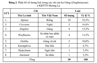 Dữ liệu Bảng 2 cho thấy trong số 8 chi, thì số lượng loài phân bố trong mỗi chi là khác nhau, chi Riềng (Alpinia) giàu loài nhất với 10 loài (chiếm 33,3% tổng số loài), đây là chi khá đa dạng, kết quả này tương tự được chỉ ra trong những công trình nghiên cứu khác của: Võ Minh Sơn và cs. [15], Hà Thị Huyền và cs. [16], tiếp đến là chi Nghệ (Curcuma) với 5 loài (chiếm 16,8%), chi Gừng (Zingiber) và chi Sa nhân bao phấn có mào (Wurfbainia) cùng có 4 loài (chiếm 13,3% tổng số loài), chi vũ nữ (Globba) với 3 loài (chiếm 10,0%), chi Địa liền (Kaempferia) gồm 2 loài (chiếm 6,7%), chi Sa nhân (Amomum) và Ngải tiên (Hedychium) cùng có 1 loài (chiếm 3,3% tổng số loài).