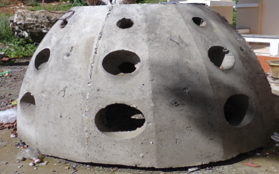 Reefball được thiết kế dạng hình vòm, có hai mặt cắt phía trên và phía dưới đường kính lần lượt là 50 cm và 180 cm, giá thể cao 120 cm độ dày của thành reefball 15 cm, phân bố các lỗ trên bề mặt chia thành 3 tầng. Tầng trên cùng gồm 6 lỗ có đường kính 15 cm, tầng thứ 2 có 6 lỗ đường kính 25 cm, tầng thứ 3 có 6 lỗ đường kính mỗi lỗ là 30 cm, tầng 1 và 2 cách nhau 10 cm, tầng 3 cách tầng 2 là 15 cm. Trên các giá thể có gắn các điểm dùng cố định san hô, trên mỗi giá thể gắn 10 điểm để trồng các tập đoàn san hô Hình 1.