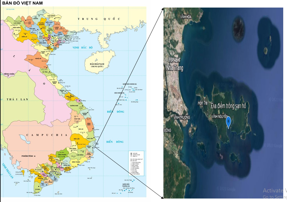 Vị trí đặt giá thể đề trồng san hô tại khu vực Trạm Thử nghiệm và Nghiên cứu biển Đầm Báy thuộc Chi nhánh Ven Biển, Trung tâm Nhiệt đới Việt - Nga. Các giá thể được bố trí theo hình tròn đồng tâm với số lượng 34 giá thể, khoảng cách giữa mỗi giá thể là 1m, địa điểm đặt các giá thể san hô tại Hình 2.
