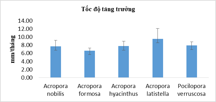 Tổng số 340 tập đoàn san hô của 5 loài được trồng trên 34 giá thể reefball, thời gian trồng trong tháng 7/2022, được tiến hành đánh giá vào tháng 8/2023, các tập đoàn san hô sau khi trồng từ 30 đến 45 ngày đã bắt đầu bám vào thành các giá thể, tạo nên thế vững chắc. Tốc độ sinh trưởng của loài san hô dạng cành Acropora nobilis từ 3,6 đến 11,3 mm/tháng, trung bình 7,7 ± 1,5 mm/tháng. Đối với loài Acropora formosa tốc độ sinh trưởng từ 5,4 đến 8 mm/ tháng, trung bình 6,7 ± 0,6 mm/tháng. Đối với loài san hô dạng bàn Acropora latistella, tốc độ sinh trưởng từ 6,5 đến 13,3 mm/tháng, trung bình đạt 9,6 ± 2,5 mm/tháng. Với loài Acropora hyacinthus, tốc độ sinh trưởng từ 4,2 đến 11,7 mm/tháng, trung bình đạt 7,7 ± 1,2 mm/tháng. Loài san hô Pocillopora verrucosa tốc độ sinh trưởng từ 5,6 đến 9,6 mm/tháng, trung bình đạt 7,9 ± 0,9 mm/tháng (Hình 3).
