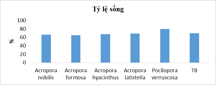 Tỷ lệ sống của các loài san hô trồng trên giá thể reefball đạt từ 64,7 đến 79,4%, trung bình đạt 69,4%; tỷ lệ sống lớn nhất đối với loài Pocillopora verruscosa 79,4% và thấp nhất là loài Acropora formosa 64,7% (Hình 4).