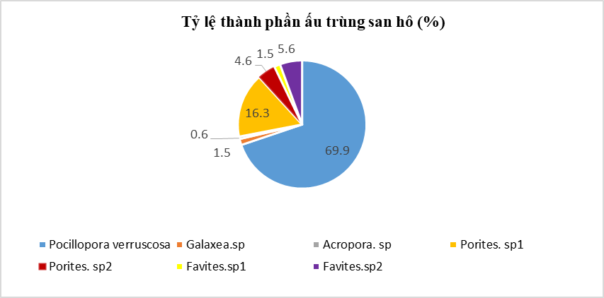 Sau 12 tháng thử nghiệm, ấu trùng san hô bám và phát triển trên tất cả 34 giá thể. Số lượng ấu trùng san hô dao động từ 7 đến 15 ấu trùng/giá thể. Tổng cộng có 325 ấu trùng san hô định cư trên 34 giá thể reefball, trung bình 9,6 ấu trùng/1 giá thể. Đường kính các tập đoàn từ 4 đến 55 mm. Ấu trùng san hô chủ yếu tập trung trên bề mặt thẳng đứng của giá thể. Thành phần ấu trùng san hô đa số là loài Pocillopora verrucosa (giống Pocillopora) chiếm 69,9% (227 ấu trùng), tiếp đến là giống Porites chiếm 20,9% (68 ấu trùng), giống Fatives chiếm 7,1% (23 ấu trùng), riêng giống Galaxea chiếm 1,5% (5 ấu trùng) và giống Acropora chiếm 0,6% (chỉ có 2 ấu trùng) (Hình 5).