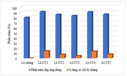 Từ Hình 1 ta thấy sau 7 ngày uống chế phẩm, các công thức CT1 và CT4 cho thấy hiệu quả tăng cường khả năng chú ý rõ rệt nhất. Cụ thể, công thức CT1 có tỷ lệ đáp ứng đúng đạt 91,42% (tăng 14,10% so với lô chứng), công thức CT4 có tỷ lệ đáp ứng đúng 90,89% (tăng 13,44% so với lô chứng). Các công thức CT2 và CT5 cũng có cải thiện khả năng chú ý (p < 0,05) nhưng ở mức độ thấp hơn so với CT1 và CT4. Công thức CT3 tuy có xu hướng tăng tỷ lệ đáp ứng đúng, song sự khác biệt không đạt mức ý nghĩa thống kê so với lô chứng (p > 0,05).