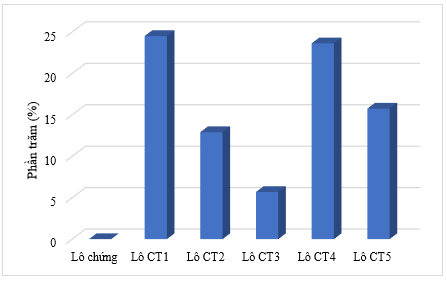 Thời gian trễ trong đáp ứng với kích thích cũng là một chỉ số quan trọng để đánh giá khả năng chú ý. Kết quả nghiên cứu cho thấy CT1 và CT4 tiếp tục là hai công thức hiệu quả nhất, giúp giảm thời gian trễ rõ rệt (24,51% và 23,63% so với lô chứng, p < 0,01). Nhóm chuột uống CT5 và CT2 đạt mức cải thiện trung bình: thời gian trễ giảm lần lượt là 15,75% và 12,91% so với lô chứng. Công thức CT3 không cho thấy tác dụng đáng kể lên thời gian phản ứng (p > 0,05).