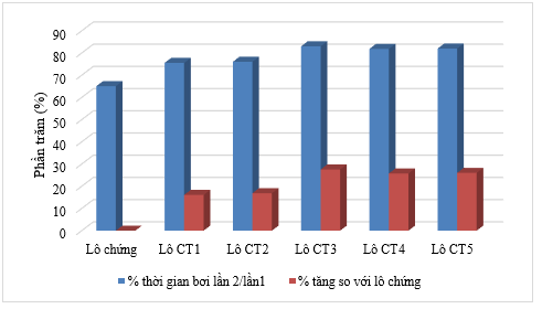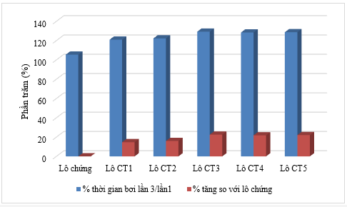 Kết quả nghiên cứu cho thấy, sau khi uống chế phẩm 60 phút (T2) các lô chuột chưa phục hồi sức lực như thời điểm ban đầu (T1), phần trăm bơi lần 2/lần 1 dưới 95%. Nhưng sau 7 ngày nghiên cứu (T3) đã thấy được tác dụng tăng sức bền của chế phẩm, phần trăm bơi lần 3/lần 1 đều đạt trên 120%. So với lô chứng, các công thức CT3, CT4, CT5 có tác dụng tăng sức bền rõ rệt, thể hiện thông qua chỉ số làm tăng phần trăm thời gian bơi so với lần 1 cả sau khi uống một liều duy nhất cũng như sau khi uống liên tục trong 7 ngày, tăng trên 20% (p < 0,01). Các công thức CT1, CT2 cũng làm tăng sức bền của chuột sau khi sử dụng chế phẩm nhưng mức độ tăng ít hơn (dưới 20%), sự khác biệt chỉ đạt với p < 0,05.