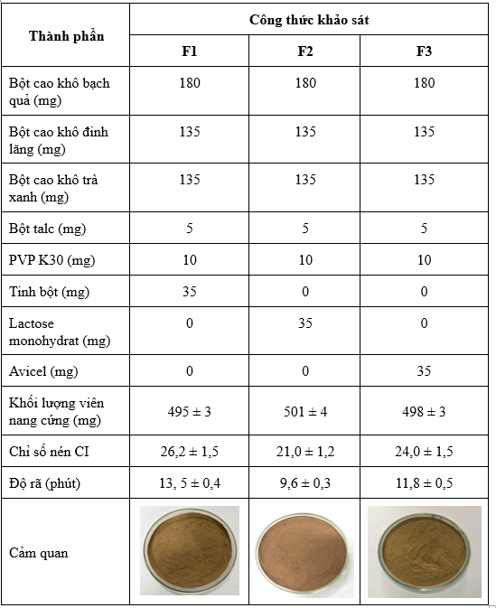 Để khảo sát sự ảnh hưởng của tá dược độn đến chất lượng viên nang, nghiên cứu cố định khối lượng bột cao khô bạch quả, đinh lăng, trà xanh, PVP K30 và bột talc. Tiến hành khảo sát các công thức F1, F2 và F3. Kết quả được trình bày ở Bảng 2.