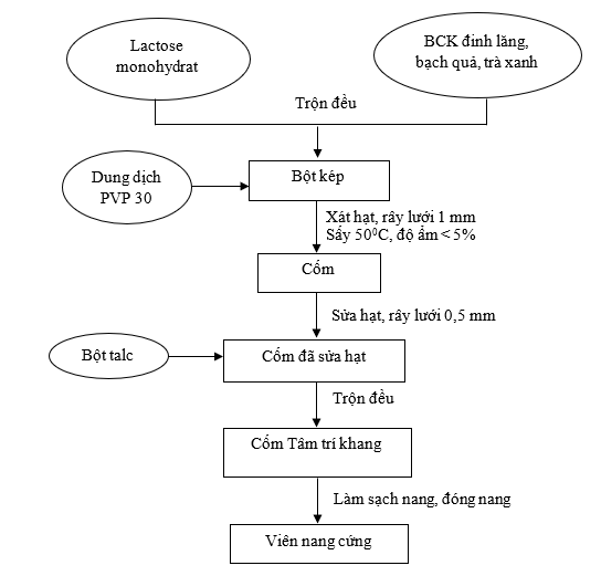Sau khi xác định được tỉ lệ cao dược liệu (mục 2.2.1) và tỉ lệ tá dược (mục 2.2.2). Tiến hành bào chế viên nang cứng Tâm trí khang quy mô 2000 viên/mẻ bằng máy vô nang bán tự động. Các thành phần được cân riêng biệt theo từng lần khảo sát. Trộn đều bột nguyên liệu và tá dược độn bằng máy trộn lập phương tạo ra khối bột kép. Tiến hành xát hạt ướt bằng cách thêm từ từ dung dịch PVP K30 hòa tan trong ethanol 70% (tỉ lệ 1:6 w/v) vào khối bột, trộn đều và xát hạt qua rây 1 mm. Cốm được sấy ở nhiệt độ 50°C đến khi đạt độ ẩm thích hợp (dưới 5%). Sau sấy, hạt được sửa qua rây có kích thước 0,5 mm. Bổ sung tá dược trơn và trộn đều. Tiến hành đóng nang vào nang cứng số 0 màu xanh lá cây. Viên nang cứng sau khi đóng được đem đi kiểm tra chất lượng.