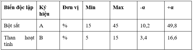 Bảng 1. Phạm vi và mức độ của các biến độc lập được sử dụng cho CCD