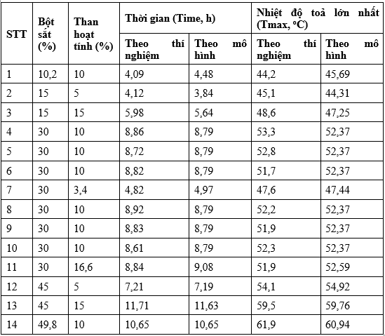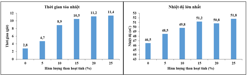 Hàm lượng than hoạt tính tác động lớn đến thời gian tỏa nhiệt. Khi không có than hoạt tính, phản ứng tỏa nhiệt vẫn diến ra, tuy nhiên thời gian duy trì ngắn chỉ là 2,8 h. Khi tăng hàm lượng than hoạt tính từ 5% lên 15% thời gian tỏa nhiệt tăng từ 4,7 h lên 10,5 h. Khi hàm lượng than hoạt tính là 25%, thời gian tỏa nhiệt hữu ích chỉ tăng nhẹ (lên 11,4 h). Tương tự, nhiệt độ tỏa chỉ tăng mạnh khi tăng hàm lượng trong khoảng từ 0% đến 15%, ở hàm lượng > 15 %, nhiệt độ thay đổi không đáng kể. Như vậy khoảng hàm lượng than hoạt tính phù hợp để khảo sát bằng mô hình RSM là từ 5% đến 15%.