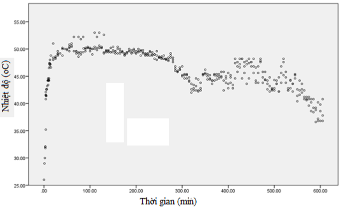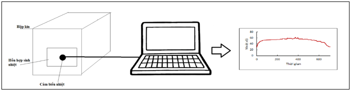 Thí nghiệm tỏa nhiệt được đặt trong hộp kín để đảm bảo điều kiện thí nghiệm đồng nhất, hỗn hợp sinh nhiệt đặt trong túi vải không dệt kích thước 13,5 × 10 cm. Sử dụng cảm biến nhiệt đặt trên bề mặt hỗn hợp. Cảm biến nhiệt được kết nối với máy tính để ghi kết quả, cài đặt thời gian ghi số liệu là 5 min/ lần (Hình 1). Thời gian tỏa nhiệt hữu ích hiệu quả được xác định khi nhiệt độ > 40oC. Kết thúc thí nghiệm khi nhiệt độ < 40oC, ghi nhận thời gian tỏa nhiệt và nhiệt độ tỏa lớn nhất của hỗn hợp. Thí nghiệm được lặp lại 5 lần.