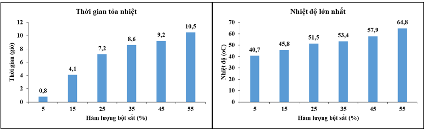 Kết quả nghiên cứu cho thấy, hàm lượng bột sắt tác động đáng kể đến thời gian và nhiệt độ tỏa của hỗn hợp sinh nhiệt (Hình 2a). Khi hàm lượng bột sắt là 5%, nhiệt độ tỏa thấp nhất chỉ 40,7oC và thời gian tỏa nhiệt kéo dài 0,8 h. Điều này phù hợp với lý thuyết khi bột sắt là nguyên liệu chính cho phản ứng tỏa nhiệt. Nhiệt độ tỏa tăng nhanh (từ 45,8-64,8oC) khi hàm lượng bột sắt tăng từ 15-55%, đồng thời thời gian tỏa nhiệt cũng tăng từ 4,1 h lên 10,5 h. Tuy nhiên, nhiệt độ cao > 60oC có thể dẫn đến kích ứng da khi sử dụng nên hoảng hàm lượng bột sắt từ 15-45% được lựa chọn để khảo sát tiếp.