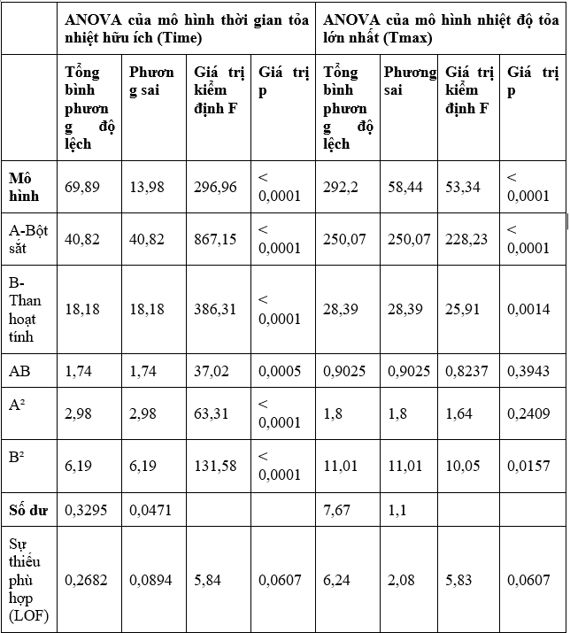 Đánh giá tính phù hợp của mô hình dựa trên kết quả phân tích ANOVA để tránh các kết quả không rõ ràng hoặc không đầy đủ trong quá trình tối ưu hóa. Kết quả phân tích phương sai ANOVA cho các mô hình được đề xuất (mô hình Time và mô hình Tmax) được thể hiện trong Bảng 3.