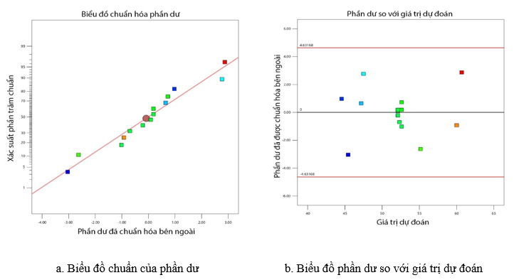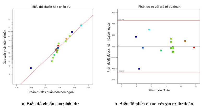 Kiểm định F đã được xem xét để đánh giá ý nghĩa của các mô hình được đề xuất. Giá trị F của mô hình Time và Tmax lần lượt là 69,89 và 292,2, rất cao, cho thấy mô hình có ý nghĩa thống kê với xác suất chỉ 0,01% xảy ra nhiễu. Bên cạnh đó, giá trị p liên quan được xem xét để quyết định xem giá trị F có đủ lớn để xác nhận ý nghĩa thống kê hay không [8]. Kết quả phân tích cho thấy, cả hai mô hình đều có p < 0,0001, điều này thể hiện mô hình có ý nghĩa thống kê. Thêm vào đó, hệ số tương quan của mô hình 1 là R² = 0,9953 và R² điều chỉnh = 0,992, tương tự, hệ số tương quan của mô hình 2 là R² = 0,9744 và R² điều chỉnh = 0,9562. Các giá trị thu được của R2, R2 điều chỉnh gần bằng 1, chứng tỏ độ phù hợp tốt của các mô hình trong dữ liệu thực nghiệm [8]. Giá trị p > 0,05 đối với chỉ số LOF cho thấy không có ý nghĩa thống kê và điều đó chỉ ra rằng các mô hình có thể được sử dụng để dự đoán các phản hồi. Đối với mô hình Time, các tham số A, B, AB, A2, B2 (p < 0,05) thể hiện mức tương quan cao của các tham số này đối với phương trình tuyến tính bậc hai của thời gian tỏa nhiệt hữu ích. Tại mô hình Tmax, chỉ có các tham số A, B, B2 thể hiện mức ý nghĩa cao (p < 0,05), các tham số còn lại AB, A2 có giá trị p > 0,05 thể hiện mức tương tác thấp đối với biến phụ thuộc Tmax.