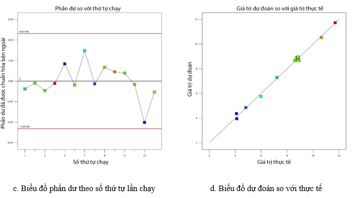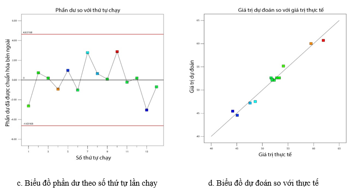 Các biểu đồ chẩn đoán về các thuộc tính thống kê của hai mô hình được minh họa trong Hình 3 và Hình 4. Phân tích biểu đồ chuẩn của phần dư có ý nghĩa đặc biệt quan trọng vì nó giúp kiểm tra giả định về phân phối chuẩn, điều kiện cần thiết để xác thực mô hình thống kê [9]. Biểu đồ chuẩn hóa phần dư (Hình 3a, 4a) xác nhận phân phối chuẩn của sai số. Biểu đồ phần dư so với giá trị dự đoán (Hình 3b, 4b) và theo từng lần chạy (Hình 3c, 4c) cho thấy phần dư phân bố ngẫu nhiên quanh đường y = 0, không có xu hướng rõ rệt, chứng tỏ mô hình phù hợp và ổn định. Ngoài ra, biểu đồ giá trị dự đoán so với thực tế (Hình 3d, 4d) cho thấy dữ liệu nằm gần đường y = x, cho thấy mô hình có độ chính xác cao.