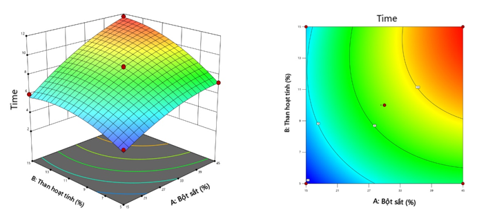 Time = -3.2185 + 0.2549 × Bột sắt + 0.8574 × Than hoạt tính + 0.0088 × Bột sắt × Than hoạt tính - 0.0031 × Bột sắt² - 0.0405 × Than hoạt tính² (2)