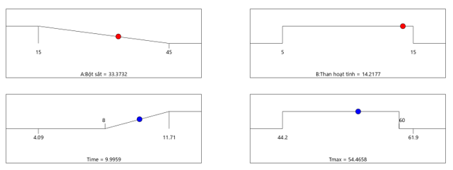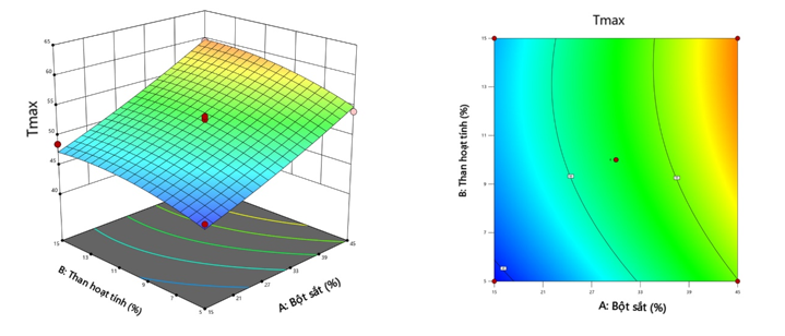Tmax = 35,5929 + 0,1766 × Bột sắt + 1,2790 × Than hoạt tính - 0,0540 × Than hoạt tính² (3)