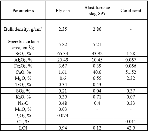 Table 1. Parameters of fly ash,blast furnace slag S95 and coral sand