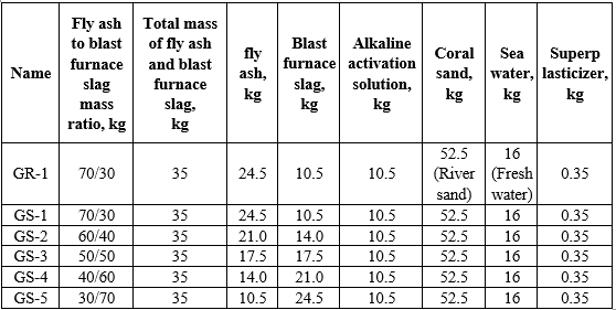 The material proportions in this study were determined based on previous research on geopolymer concrete that used river sand and freshwater [14-17]. Table 3 shows the mix proportions for various mass ratios of fly ash to blast furnace slag in one batch. This study's components, such as coral sand, seawater, and alkaline activation solution, remained constant.