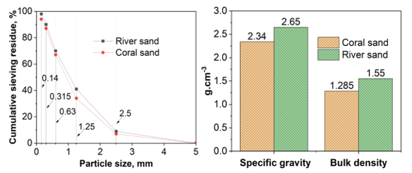 The size distribution of coral sand compared to river sand used for concrete is shown in Figure 3. The results show that the particle size distribution of coral sand is similar to that of river sand. Additionally, the specific gravity and bulk density of coral sand are approximately 11% and 17% lighter than river sand, respectively.