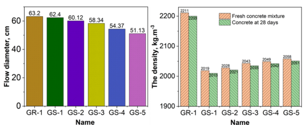 - The density of the geopolymer concrete mixture was measured using a 1-litre standard container by TCVN 3108:2022. The density of the hardened sample was determined in line with TCVN 3115:2022.