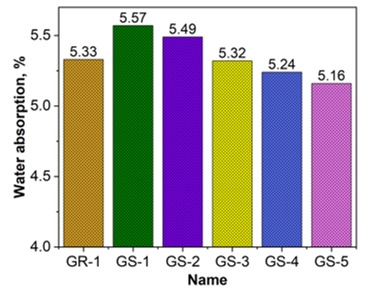 Figure 5 illustrates the water absorption of the samples. The results indicate that using coral sand and seawater leads to increased water absorption. Cl- ions from coral sand and seawater do not react and remain inside the samples, causing local internal damage, increasing porosity and leading to increased water absorption. Elevating the blast furnace slag content in GS samples results in the formation of a greater quantity of calcium-rich gels, such as C-A-S-H, during the solidification process. This facilitates the filling of pores and leads to a denser structure. Consequently, the water absorption of GS samples diminishes with an escalation in blast furnace slag content.
