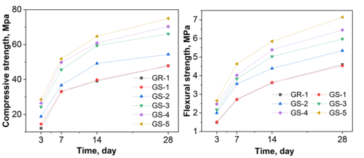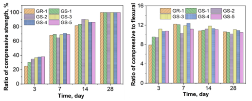 Figure 8a shows the ratio of the compressive strength of the sample over time compared to that at 28 days. The results show that the compressive strength at 3, 7 and 14 days respectively reached about (30 ÷ 38)%; (64 ÷ 71)%; (81 ÷ 91)% for GS samples; for GR-1 samples it reached about 25%; 68%; 82%. Furthermore, the ratio of compressive strength to flexural strength of GS samples fluctuated around 9 ÷ 12, which was similar to that of GR-1 sample (Figure 8b).