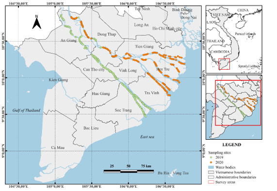 Figure 1. Surveying sites from 2019 to 2020 in the Mekong Delta, Vietnam