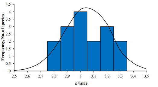 The results of LWR analyses of 16 fish in the Mekong Delta are summarized in Table 1. All regressions were highly significant, with the correlation coefficient (r) ranging from 0.88 to 0.99 (p<0.05). The frequency distribution of b values with a superimposed normal curve is shown in Figure 2. The mean value of b is estimated as 3.002, with a standard error of 0.042, i.e., the mean is close to 3, and 11 species had b close to 3 (isometric type of growth). The b values varied from 2.72 for Johnius trachycephalus (Bleeker, 1851) to 3.28 for Arius maculatus (Thunberg, 1792), of which 8 species had positive allometry (b>3), 7 species had negative allometry (b<3), and just one species isometry (b=3). The females of A. maculatus, Cephalocassis borneensis (Bleeker, 1851), Coilia lindmani Bleeker, 1857, Coilia rebentischii Bleeker, 1858, Parambassis wolffii (Bleeker, 1850), Polynemus melanochir Valenciennes, 1831 had higher b values than males. Female’s b values ranged from 2.77 for Clupeoides borneensis Bleeker, 1851 to 3.41 for A. maculatus and male’s b values ranged from 2.76 for P. wolffii to 3.15 for A. maculatus.