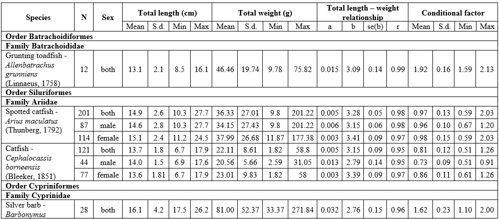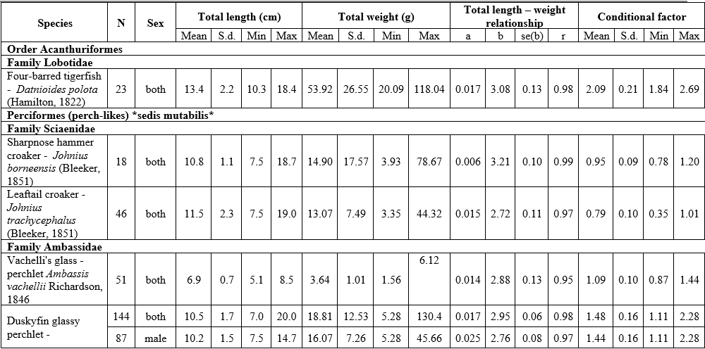 The conditional factor for 16 fish species is shown in Table 1. The value of CF ranged from 0.28 for C. rebentischii to 2.09 for Datnioides polota (Hamilton, 1822). No significant sex differences in CF values were found for A. maculatus, Cl. borneensis, C. lindmani, and P. melanochir. Female of C. borneensis and P. wolffii had higher values of CF than male, C. rebentischii – opposite.