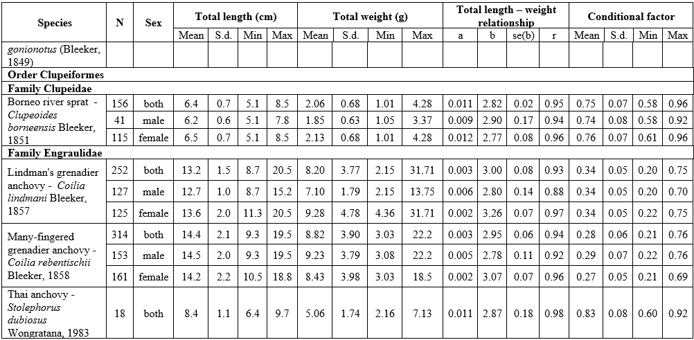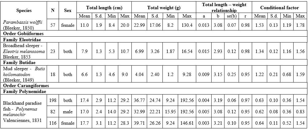 Table 1. Length-weight relationship and conditional factor of the fish species of the Lower Mekong Basin, Vietnam