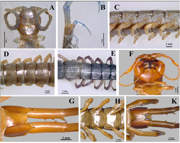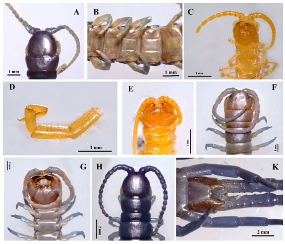 Figures 1. A-B: Alluropus calcaratus (A- cephalic plate and tergite 1st; B- sternites); C-D: Cryptops (Cryptops) tahitianus (C- forcipular segment; D- last leg); E: Cryptops (Paracryptops) indicus (forcipular segment); F-G: Otostigmus multidens (F- Cephalic and tergites 1-4; G- forcipular segment); H-K: Otostigmus aculeatus (H- Cephalic and tergites 1-3; K- Last sternite and last legs).