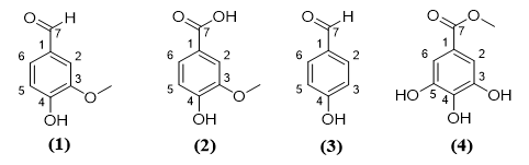 Vanillin (1): ESI-MS: m/z 153 [M+H]+; 1H NMR (DMSO-d6, 600 MHz): δH 7,38 (1H, d, J = 1,8 Hz, H-2); 6,96 (1H, d, J = 8,4 Hz, H-5); 7,43 (1H, dd, J = 8,4; 1,8 Hz, H-6); 9,77 (1H, s, H-7); 3,92 (3H, s, 3-OCH3); 10,24 (1H, brs, 4-OH); 13C NMR (CDCl3, 150 MHz): δC 128,7 (C-1); 126,0 (C-2); 148,2 (C-3); 153,0 (C-4); 110,7 (C-5); 115,4 (C-6); 191,0 (C-7); 55,6 (3-OCH3).