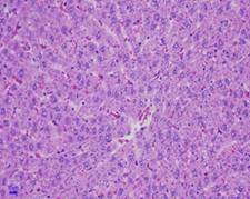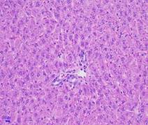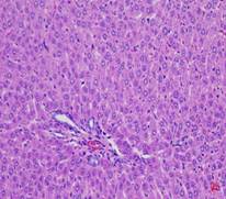 Quan sát hình ảnh vi thể gan sau 28 ngày uống chế phẩm dưới kính hiển vi với độ khuếch đại 200 lần, nhận thấy hình thái vi thể gan chuột ở cả ba lô (lô chứng, lô trị 1, lô trị 2) không thấy xuất huyết, hoại tử, thoái hóa tế bào gan. Nhu mô gan bình thường (Hình 2).