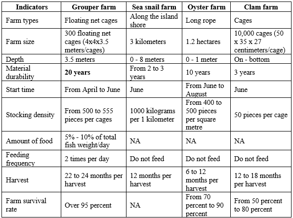 In this study, the authors selected 4 farm types: grouper farming, sea snail farming, oyster farming, and clam farming. The quantifiable factors affecting the farming systems were then determined for inclusion in the analysis. The results are shown in Table 1 below: