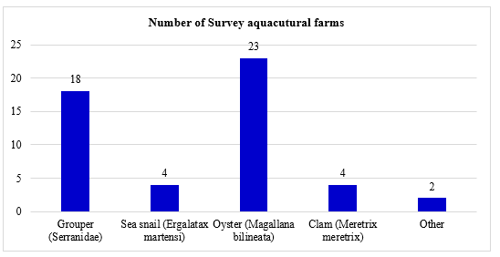 Figure 2 below shows the number of aquaculture households and farms surveyed in Bai Tu Long Bay in 2024. In terms of the 51 households and farms surveyed, the oyster aquaculture type accounted for the majority, with 23 farms, followed closely by the grouper aquaculture type, with 18 farms. The sea snail aquaculture type and clam aquaculture type were equal, with 4 farms each. The two farms with sea snails and the other farms had the lowest number of farms, with 4 and 3 farms, respectively.