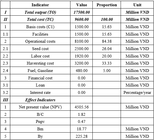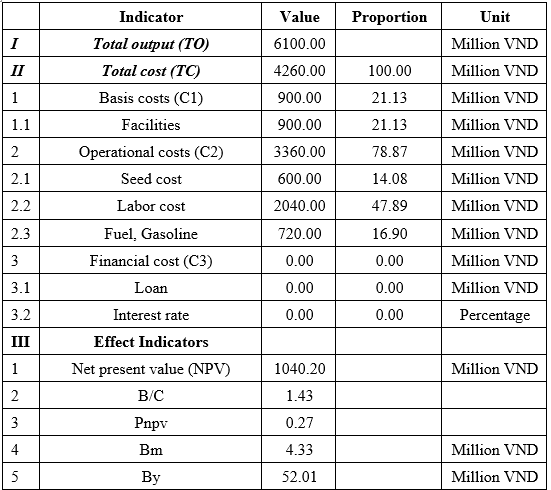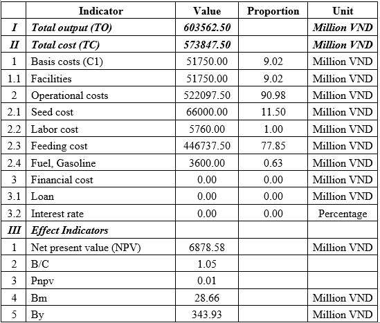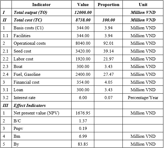 In this study, the authors chose a cash flow discount rate of 6%/year, corresponding to the average interest rate of banks lending for the purpose of developing agriculture, forestry, and fishery; the cycle is 20 years because aquaculture is a specific industry, and different species have different growth and development times. In addition, aquaculture systems in Vietnam were developed according to long-term goals. From there, the efficiency indicators of each specific farm are calculated.