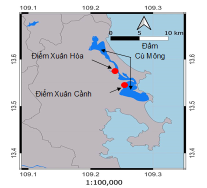 Theo Nguyễn Xuân Hòa và cộng sự (2010) cây ngập mặn ở đầm Cù Mông phân bố chủ yếu tại phường Xuân Cảnh. Trong quá trình khảo sát, chúng tôi ghi nhận dải cây ngập mặn nằm dọc theo các kênh dẫn nước biển ở phường Xuân Cảnh và Xuân Bình. Mẫu cua được thu vào mùa mưa (tháng 12 năm 2022) và mùa khô (tháng 4 năm 2023) tại dải cây ngập mặn ở phường Xuân Cảnh và Xuân Bình thị xã Sông Cầu, tỉnh Phú Yên (Hình 1).