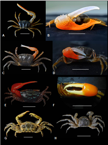 A, B - Gelasimus vocans; C, D - Gelasimus borealis; E, F - Paraleptuca splendidus; G - Macrophthalmus milloti; H - Scopimera globosa. Thước đo là 1 cm.