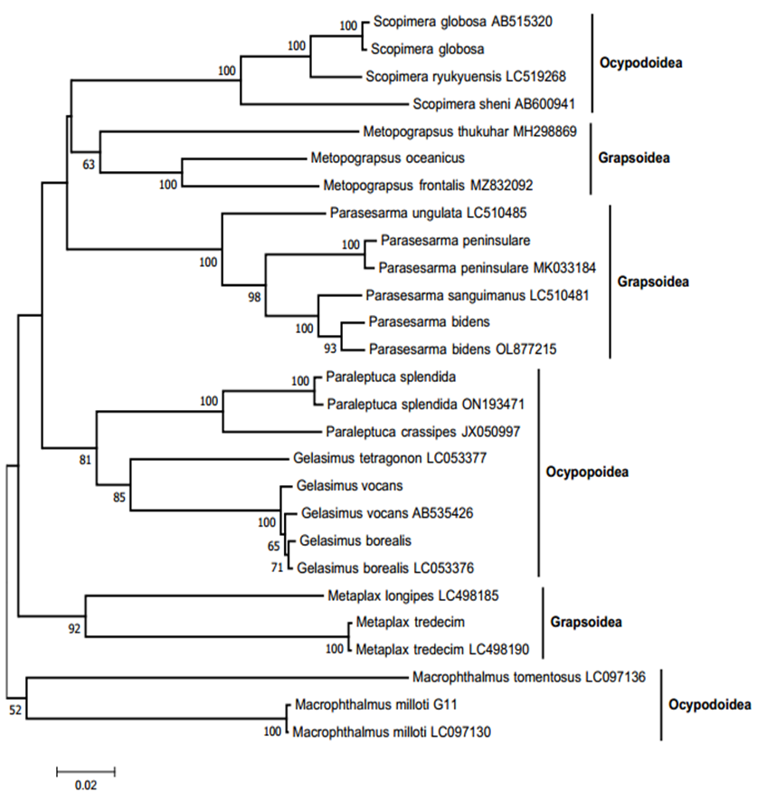 Ghi chú: 1. S. globosa AB515320, 2. S. globosa, 3. S. ryukyuensis LC519268, 4. Scopimera sheni AB600941, 5. Metopograpsus oceanicus, 6. M. frontalis MZ832092, 7. M. thukuhar MH298869, 8. Metaplax tredecim, 9. M. tredecim LC498190, 10. M. longipes LC498185, 11. P. splendida, 12. P. splendida ON193471, 13. crassipes JX050997, 14. Gelasimus vocans, 15. Gelasimus vocans AB535426, 16. G borealis, 17. G. borealis LC053376, 18. G. tetragonon LC053377, 19. P. bidens, 20. P. bidens OL877215, 21. P. peninsulare, 22. P. peninsulare MK033184, 23. ungulata LC510485, 24. P. sanguimanus LC510481, 25. P. milloti, 26. M. milloti LC097130, 27. M. tomentosus LC097136