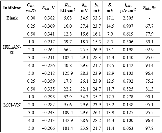 The calculated values of icor are presented in Table 1. In general, an increase in the inhibition efficiency (Zinh) was observed with increasing concentration of the tested formulations (Table 1). The highest Zinh value of 97.8% for MCI-VN was achieved at Cinh = 5.0 wt.%, while the maximum for IFKhAN-80 was 96.4%.