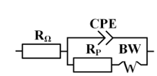 Figure 3. The equivalent circuit used to analyze electrochemical impedance spectra, where RΩ - solution ohmic resistance, CPE - constant phase element, Rp - polarization resistance of the electrochemical reaction, BW - Warburg impedance.