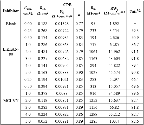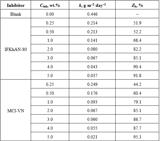 Gravimetric experiments over 30 days demonstrated complete corrosion suppression at Cinh ≥ 2.0 wt.% for MCI-VN, while IFKhAN-80 required Cinh ≥ 3.0 wt.% to achieve the same effect.