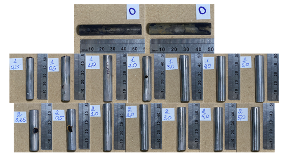 The appearance of the steel specimens at the end of the exposure period is shown in Figure 4. In the control experiment, multiple corrosion defects - such as stains, clusters of pits, and localized corrosion - were observed on the metal surface, visible to the naked eye. No corrosion products or pitting were detected for the IFKhAN-80 inhibitor at Cinh ≥ 3.0 wt.%. At lower concentrations, isolated or grouped pits with diameters up to 3 mm were observed. Adding MCI-VN at Cinh ≤ 1.0 wt.% resulted in forming 1-2 pits with diameters ranging from 3 to 5 mm. With a further increase in concentration to Cinh ≥ 2.0 wt.%, no signs of corrosion damage were detected on the rebar surface, which retained a metallic sheen.